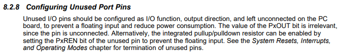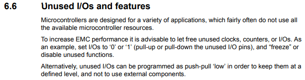 Como este documento faz parte de uma nota de aplicação de hardware de baixo consumo, ele recomenda aqui não deixar o pinos sobressalentes flutuando, seta-los como push-pull, habilitar o pull-up/pull-down no mesmo nível que está setando sua saída e alternativamente setar o pino como entrada analógica.