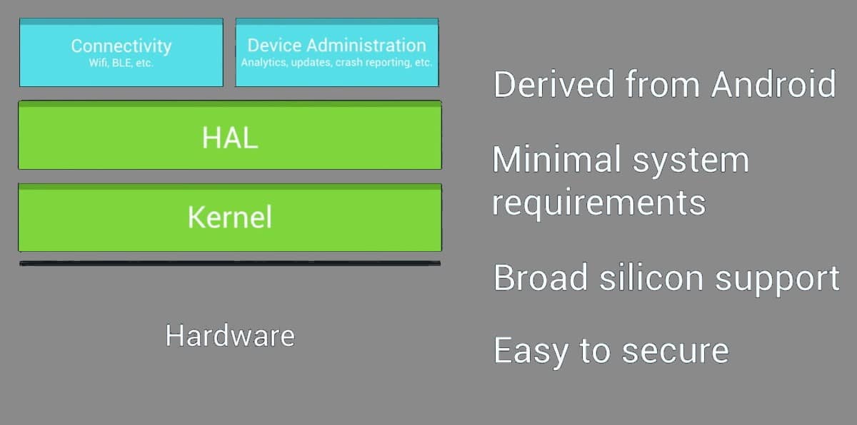 A tendência é surgirem soluções para IoT das empresas de tecnologia, visto a plataforma Artik da Samsung, o sistema operacional LiteOS da Huawei, o mbed OS da ARM, entre outras. O que o Google fez foi criar um sistema operacional baseado em Android, chamado Project Brillo, voltado para dispositivos com restrições de memória e que necessitem de um controle de energia eficiente. Seria possível portar tal sistema operacional em equipamentos a partir de 32 MB de memória RAM e 128 MB de Flash.