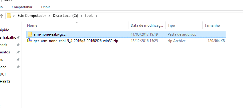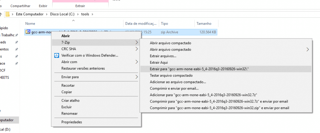 – Descompacte o gcc-arm-none-eabi-5_4-2016q3-20160926-win32.zip em C:\tools: