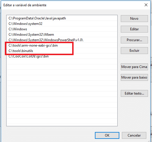 Adicione no PATH em Variáveis de Ambiente > Variáveis de Sistema > Path os diretórios para o Make e ARM GCC que criamos há pouco e clique em OK: