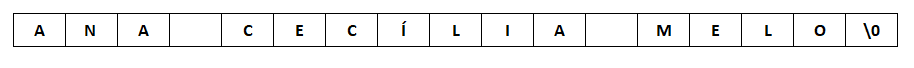 A figura 1 ilustra um exemplo de String, mostrando como o vetor de caracteres armazena o valor “ANA CECÍLIA MELO”. Esse vetor tem 17 posições, incluindo os espaços e o “\0”, na última posição, que é o terminador da String. Importante ressaltar aqui que Strings podem ser manipuladas como ponteiros. Isto significa que existe um ponteiro para o primeiro caractere da String, exatamente como acontece com vetores e matrizes. Exemplo: