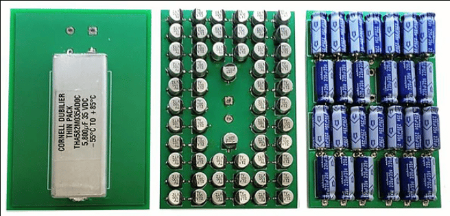 Para enfrentar os desafios do perfil de baixa altura, redução da área ocupada da placa de circuito, longa vida útil e confiabilidade aprimorada do sistema, a Cornell Dubilier Electronics (CDE) desenvolveu uma família de capacitores eletrolíticos de alumínio de perfil ultrabaixo (ULP), conforme mostrado abaixo na Figura 1. Eles podem substituir grandes conjuntos de capacitores de tântalo sólido SMT. A série ULP é projetada especificamente para aplicações que exigem capacitância em massa e perfis de placa mais baixos, e oferece densidade de energia consideravelmente maior do que matrizes de capacitores SMT. Esse design permite que os engenheiros usem um único componente para economizar espaço, peso e custo, além de melhorar a confiabilidade. Com densidade de energia superior a 0,4 J/cc, um único capacitor ULP fornece armazenamento em massa muito maior em um espaço menor do que um banco de capacitores SMT de baixo perfil. Os valores de capacitância variam de 500 µF a 24.000 µF. As tensões de trabalho variam de 4 a 63 WVDC, com vida útil de 3.000 horas a 85°C sem redução de tensão.