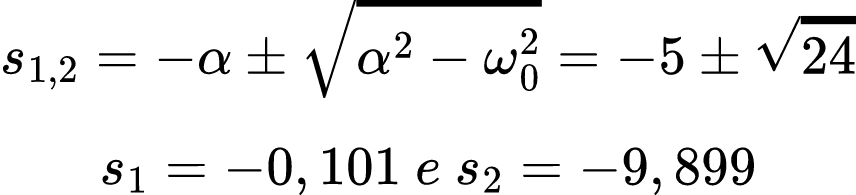 Como α > ω0, a resposta será do tipo amortecimento supercrítico, com duas raízes reais e negativas. Estas raízes são: