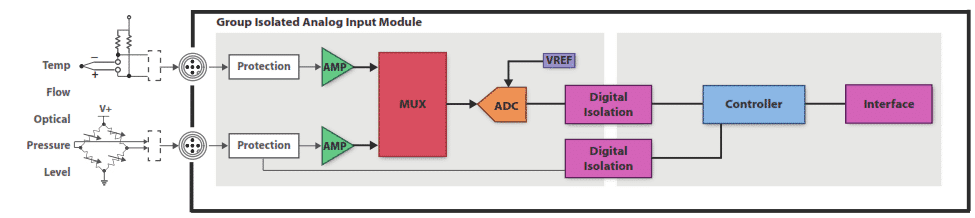 Na figura abaixo vemos um exemplo de diagrama de blocos de uma entrada analógica.
