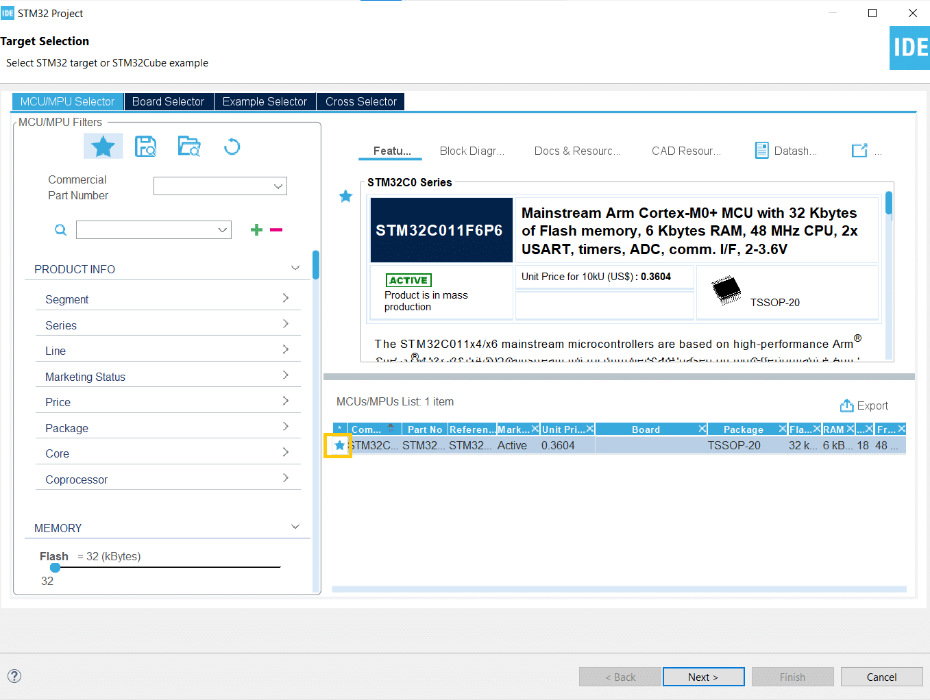 - Neste momento será exibido uma tela com todas as famílias de microcontroladores da família STM32 suportadas pela CubeIDE. Para poder encontrar nosso microcontrolador, iremos no campo de busca “commercial part number” e digitaremos “STM32C011F6P6”, que é o microcontrolador do Franzininho. Selecione-o e clique em “Next”.