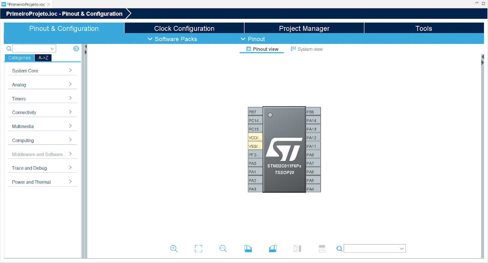 - Após isso, teremos a tela de carregamento do CubeMX como demonstrado na figura. Essa etapa, auxilia na configuração dos periféricos, como GPIO ou USART, as pilhas de middleware e a configuração dos valores de clock, além de ajudar a resolver conflitos de pinagem e também ter uma calculadora de consumo de energia.