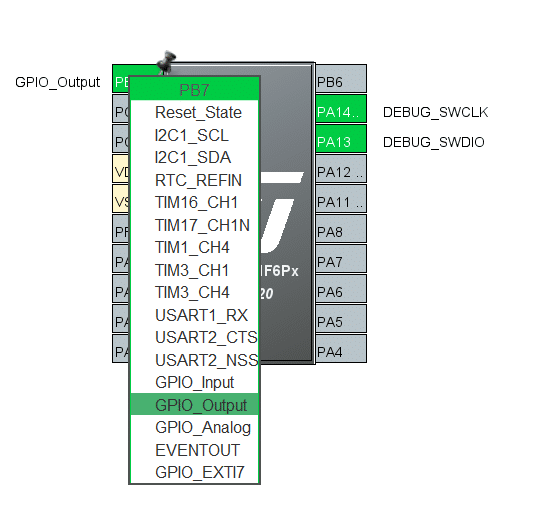 Nota-se que os pinos PA13 e PA14 foram configurados para receber o SWCLK e SWDIO do ST-Link/V2.