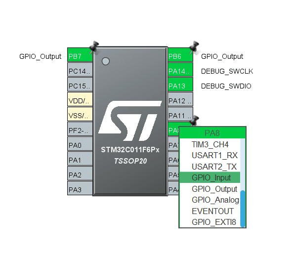- Neste ponto, você está pronto para salvar o projeto e iniciar o desenvolvimento de código. No entanto, neste artigo, também vamos configurar alguns periféricos, conforme mostrado nas imagens abaixo. Selecionamos os pinos PB7 e PB6, definindo-os como saídas GPIO, e o PA8 como entrada GPIO. Em seguida, na seção “System Core > GPIO”, aparecerão os pinos, e selecionamos cada um individualmente para as configurações necessárias. Definimos o PA8 como PULL_UP e sua etiqueta como “botão” (opcionalmente, você pode alterar o nome da etiqueta). Para os pinos PB6 e PB7, deixamos as configurações padrão, mudando apenas a etiqueta para “LED1” e “LED2”.