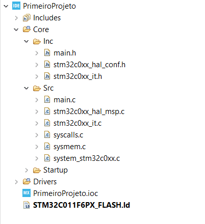 Quando o projeto é gerado, ele apresenta uma estrutura como demonstrado na imagem, contendo o arquivo STM32C0xx.h, que traz todas as estruturas de ponteiros para os registradores. Dentro dessa mesma estrutura, estão os arquivos gerados pelo CubeMX para a camada HAL de programação. Ao expandir a pasta “inc” da estrutura de arquivos, você encontrará os arquivos de inclusão necessários.