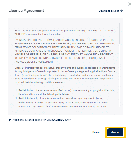 - Após aceitar a licença e, se desejar, criar uma conta na STM, o download iniciará automaticamente. Com a conclusão do download, descompacte o arquivo baixado para prosseguir com a instalação.