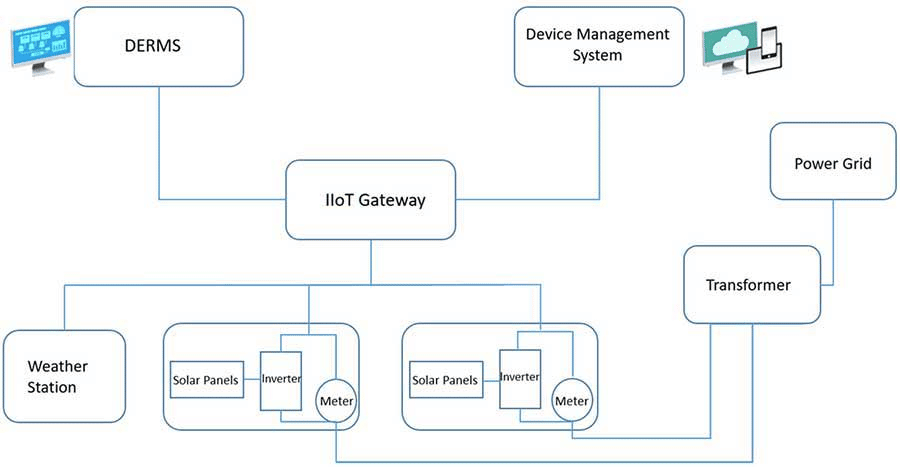 Uma solução que consiste em gateways de IIoT, com seu poder de computação e interfaces de comunicação integradas, pode ajudar a fornecer a plataforma para aquisição e processamento de dados contínuos e seguros. Os dados adquiridos de inversores, medidores, transformadores e outros dispositivos de borda podem ser enviados para um sistema de gerenciamento DER para manter a rede em estado estável e atender aos requisitos de energia. Os gateways IIoT também podem ser usados para estimar a energia dos operadores de fazendas solares, pois há acesso instantâneo a grandes volumes de dados. O uso de registro e processamento de dados eficiente, conectividade segura de dados de inversores e dispositivos de monitoramento climático, com tecnologia de inteligência artificial, permite prever com precisão a quantidade de energia necessária de recursos de energia renovável e, assim, atender aos requisitos de energia dos consumidores.