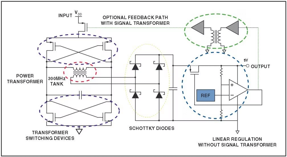 Microtransformadores semelhantes são usados para transferir energia. Devido à sua pequena relação L/R, os transformadores precisam ser comutados em alta frequência para evitar saturação de corrente e alcançar alta eficiência. Um exemplo de quatro chaves CMOS complementares implementadas em uma configuração acoplada em cruz, junto com o transformador formando oscilação sustentada, é mostrado na Figura 5. Os tamanhos dos componentes do tanque são otimizados para maximizar a eficiência de transferência de energia. Diodos Schottky integrados foram usados como dispositivos de retificação. Esses diodos ligam e recuperam rápido o suficiente para a retificação de 300 MHz. Os diodos precisam ser dimensionados de modo que permaneçam na região Schottky durante a retificação. Um regulador linear no secundário mantém a tensão de saída com variações de carga de saída ou de fonte de entrada. A eficiência é menos preocupante para muitas aplicações de baixa potência. Para melhorar a eficiência e manter a regulação de energia, um transformador de sinal de feedback opcional pode ser adicionado. O sinal de feedback ligaria/desligaria o tanque LC em vez de controlar diretamente as chaves do transformador. Essa abordagem separa a regulação da energia da conversão de energia, permitindo uma transferência de energia otimizada e mantendo a regulação.