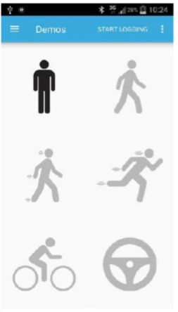 O aplicativo human activity recognition usa o acelerômetro Sensortile.box, LSM6DSOX MEMS e sua funcionalidade de Machine Learning Core (MLC) embarcado. As seguintes atividades podem ser reconhecidas por ícones na tela, independentemente da orientação Sensortile.box: