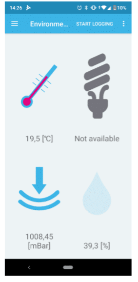 Quando você executa o aplicativo Barômetro e conecta o dispositivo Sensortile.box, o aplicativo ST BLE Sensor mostra uma tela de monitoramento para os sensores ambientais.