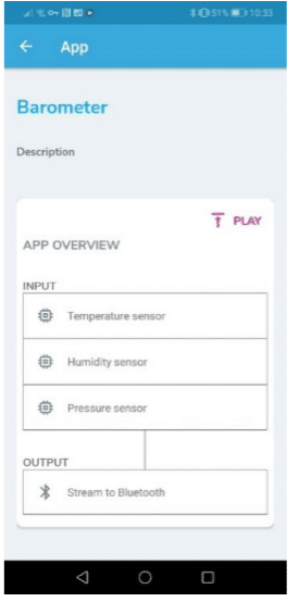 O aplicativo Barômetro utiliza os sensores ambientais presents no Sensortile.box (STTS751, LPS22HH e HTS221).