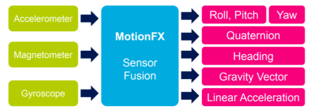 O algoritmo usa os dados do acelerômetro e giroscópio LSM6DSOX iNemo de 6 eixos e os dados do magnetômetro compensado LIS2MDL de 3 eixos como entradas, combinando os dois sensores em um sensor virtual de 9 eixos.