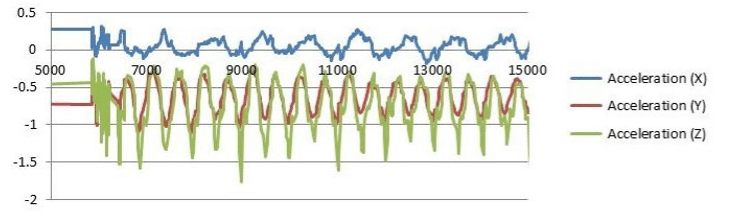O sensor utilizado é o acelerômetro LSM6DSOX configurado no modo de alto desempenho, com uma taxa de dados de saída de 6666 Hz, para atingir o nível mais alto de largura de banda e melhor desempenho.