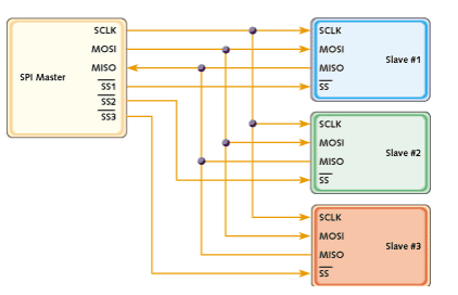 Assim como o I2C, o SPI apresenta o conceito de mestre e escravo da comunicação. O mestre inicia a transferência de dados e controla o sinal de clock para estabelecer o sincronismo. A transferência de dados processa-se em full-duplex sobre os sinais MOSI (Master Output Slave Input) e MISO (Master Input Slave Output). A taxa de transferência é definida pelo processador, no papel de mestre, através do sinal SCLK. A seleção do periférico é feita através do sinal SSn. Nessa configuração, pode haver um mestre e vários escravos no barramento SPI, como mostrado na Figura 1.