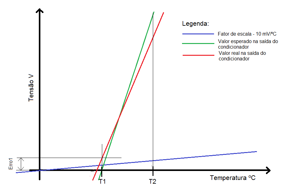 Assim, se for somado o Erro1 (constante) à saída real do condicionador, a curva será deslocada de forma que os valores em T1 coincidam para as duas retas. Veja na Figura 4.