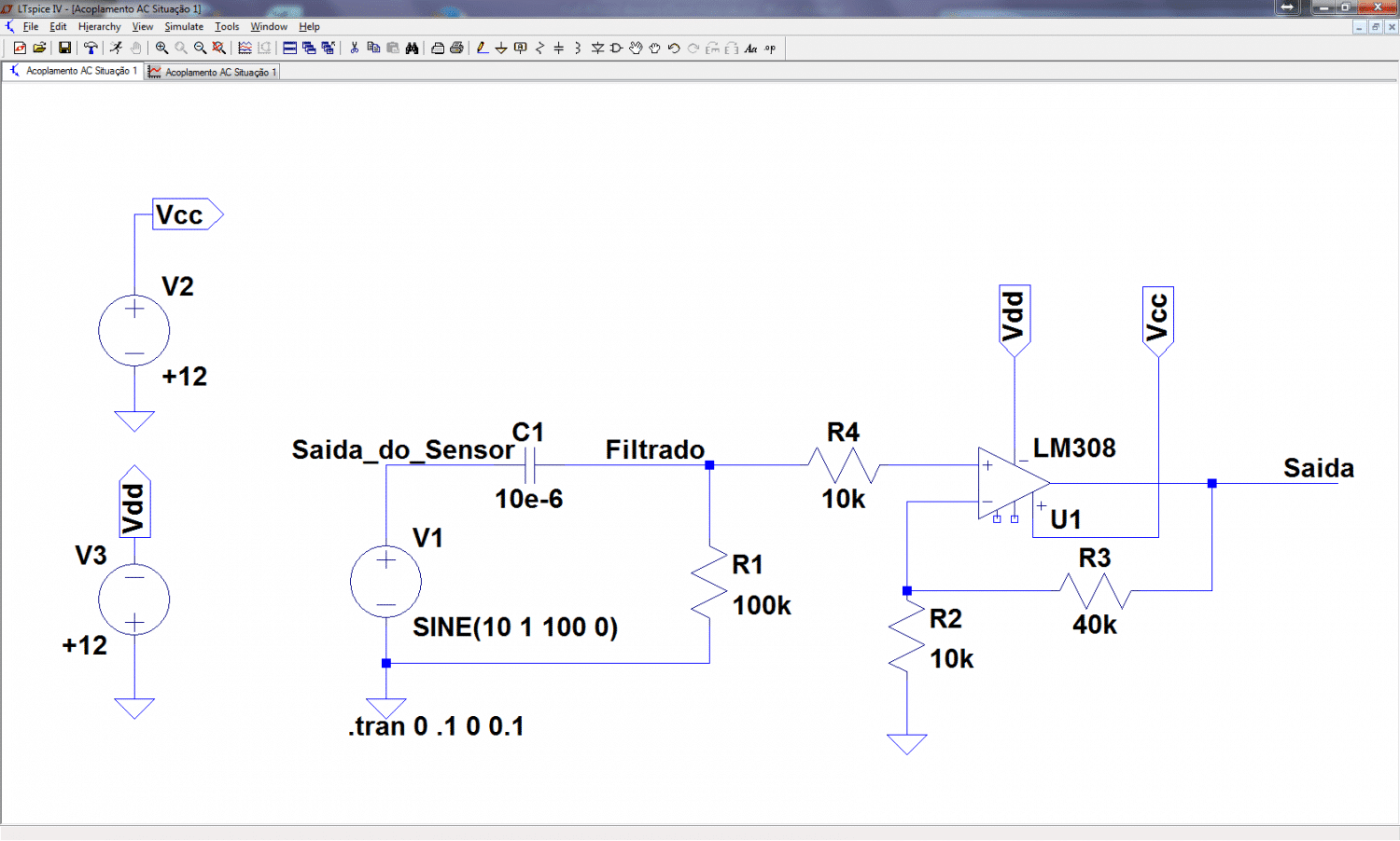 Nessa situação, o sinal em CA é menor do que o necessário e a saída é referenciada ao GND. Pode-se observar o circuito desenvolvido para essa situação na Figura 2. O sinal do sensor tem 2 Vpp, e o de saída tem 10 Vpp.
