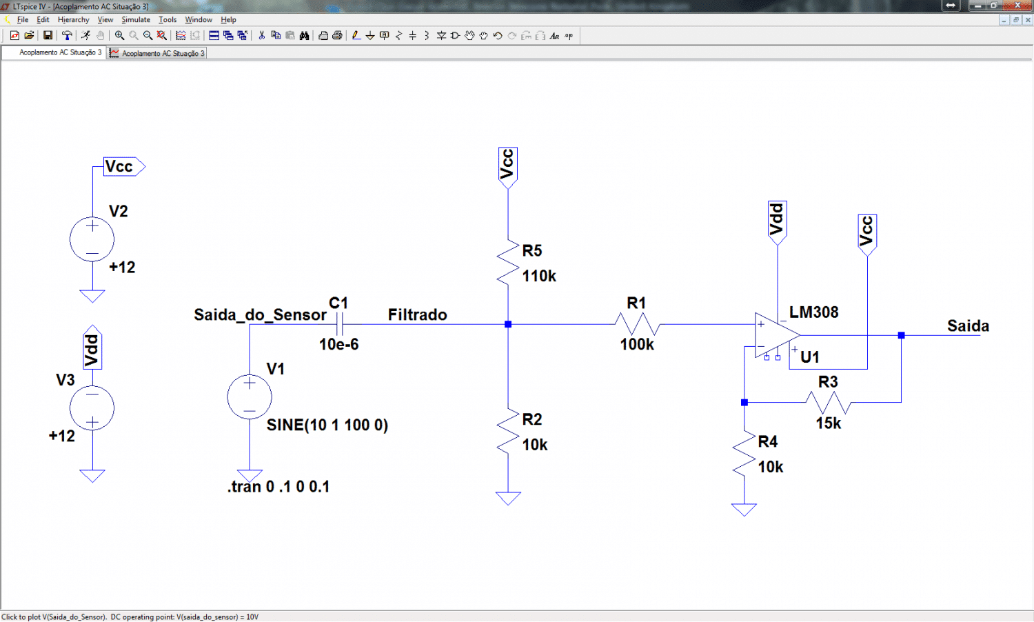 Suponhamos que o nosso sensor ou transdutor tenha uma componente em corrente contínua de 10 Vcc. Vamos detalhar alguns cálculos comuns aos circuitos utilizados nos exemplos.