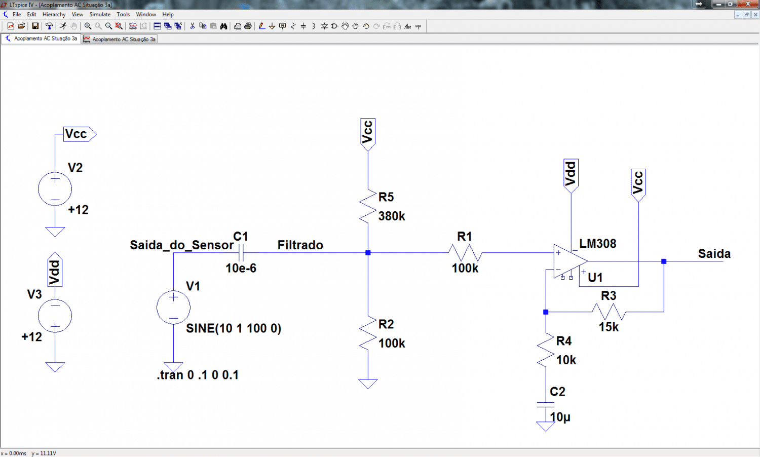 Observe que o circuito apresentado na Figura 10, a tensão de offset é determinada pelo divisor resistivo formado por R5 e R2, enquanto que a atenuação do sinal filtrado é produzida pela relação dos resistores R6 e R5 // R2. A simulação desse circuito produziu o seguinte gráfico de sinais (Figura 11).