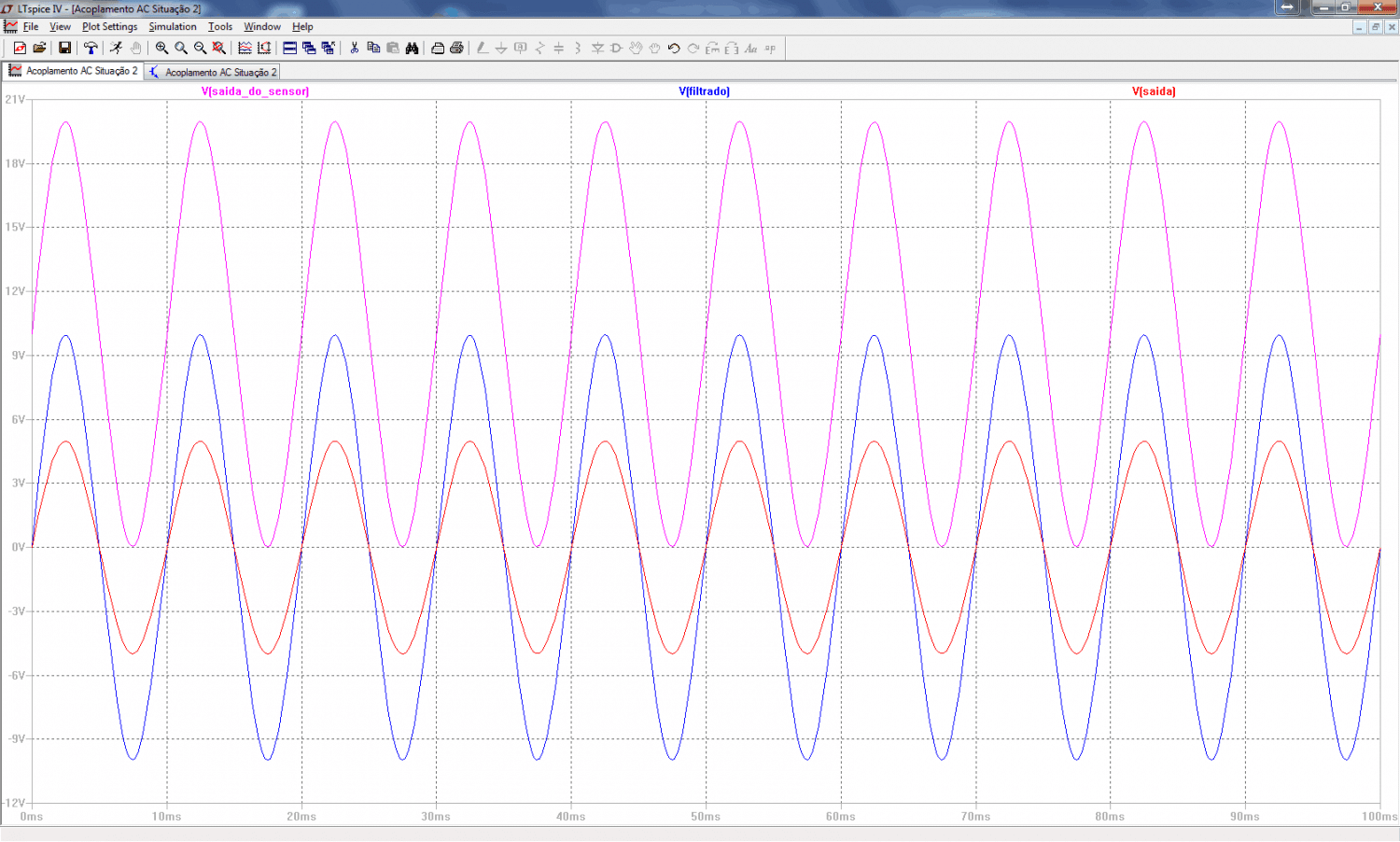 Observe que o circuito apresentado na Figura 4 realiza uma atenuação puramente resistiva do sinal CA filtrado. A simulação desse circuito produziu o seguinte gráfico de sinais (Figura 5).