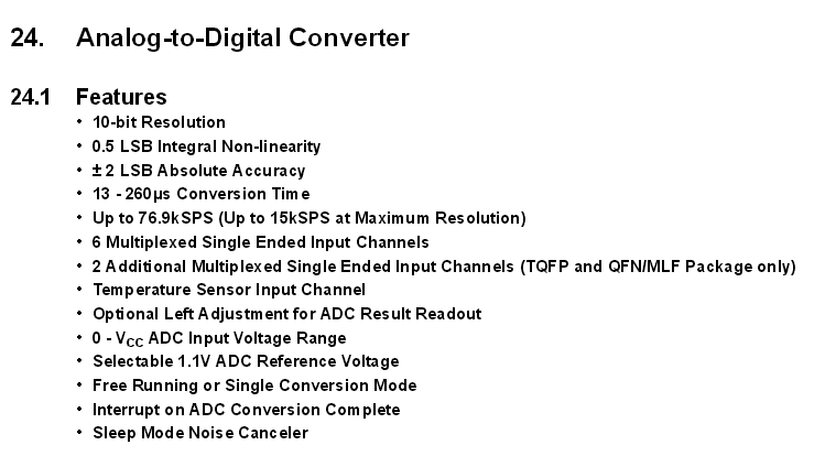 Na Figura 7 pode-se observar um resumo das principais especificações do conversor A/D do ATMEGA328. Note que o conversor tem 10 bits de resolução, uma precisão de 8 bits e taxa máxima de amostragem de 76,9 kSPS (kiloAmostras por segundo – 8 bits).