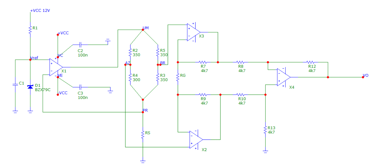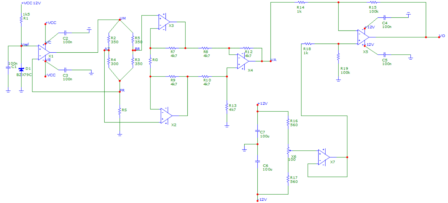 Após a seleção do ganho, iniciou-se a montagem do circuito. No entanto, foi identificada a presença de ruído, instabilidade no funcionamento e a necessidade de realizar um ajuste de “zero”. O circuito final está representado na figura a seguir: