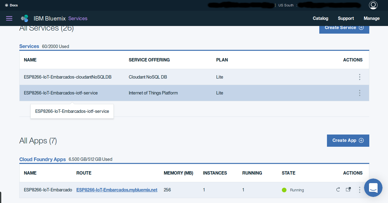 Primeiro, é preciso criar e configurar uma aplicação na plataforma bluemix para receber os dados do nosso dispositivo. Para isso, acesse o portal do bluemix, e crie uma conta. Depois de criada, realize o login. Crie uma organização e um space para suas aplicações. A região escolhida no meu caso foi “US South”.