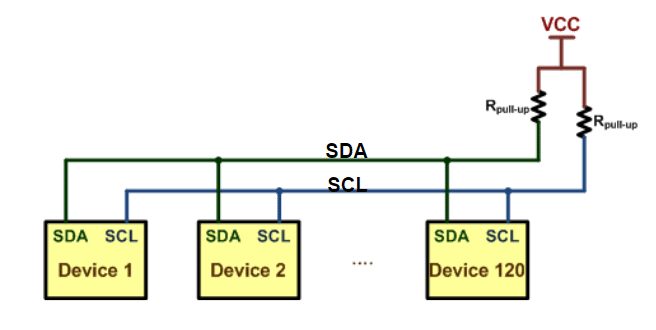 O protocolo I2C, desenvolvido pela Philips, foi criado para facilitar a comunicação entre periféricos dentro de um mesmo circuito, como mostrado na imagem abaixo. Este protocolo síncrono utiliza apenas duas linhas: SDA (linha de dados) e SCL (linha de clock). Sua simplicidade e eficiência tornam o I2C uma escolha popular para a comunicação entre microcontroladores e diversos dispositivos periféricos, como sensores e displays.