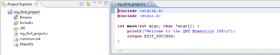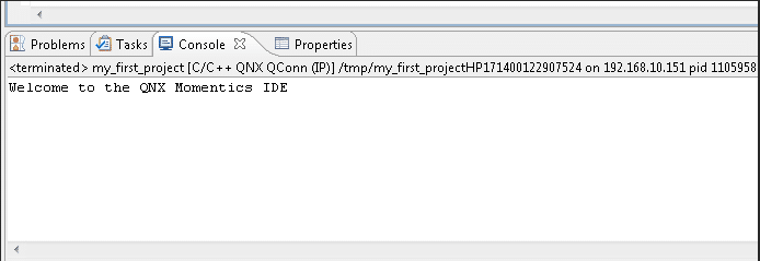 Você verá no console da IDE a seguinte mensagem “Welcome to the QNX Momentics IDE”. Simples assim!
