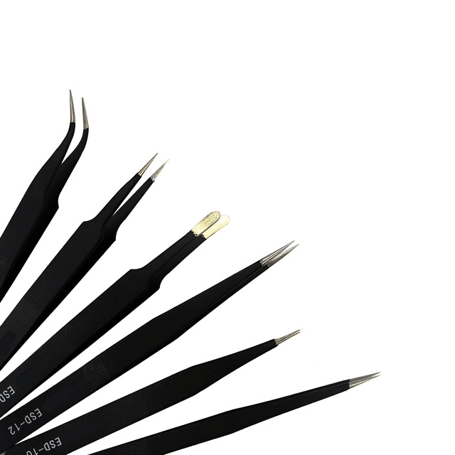 Um jogo de pinças SMD irá te ajudar no trabalho com componentes pequenos. Existem alguns modelos e até antiestáticos: