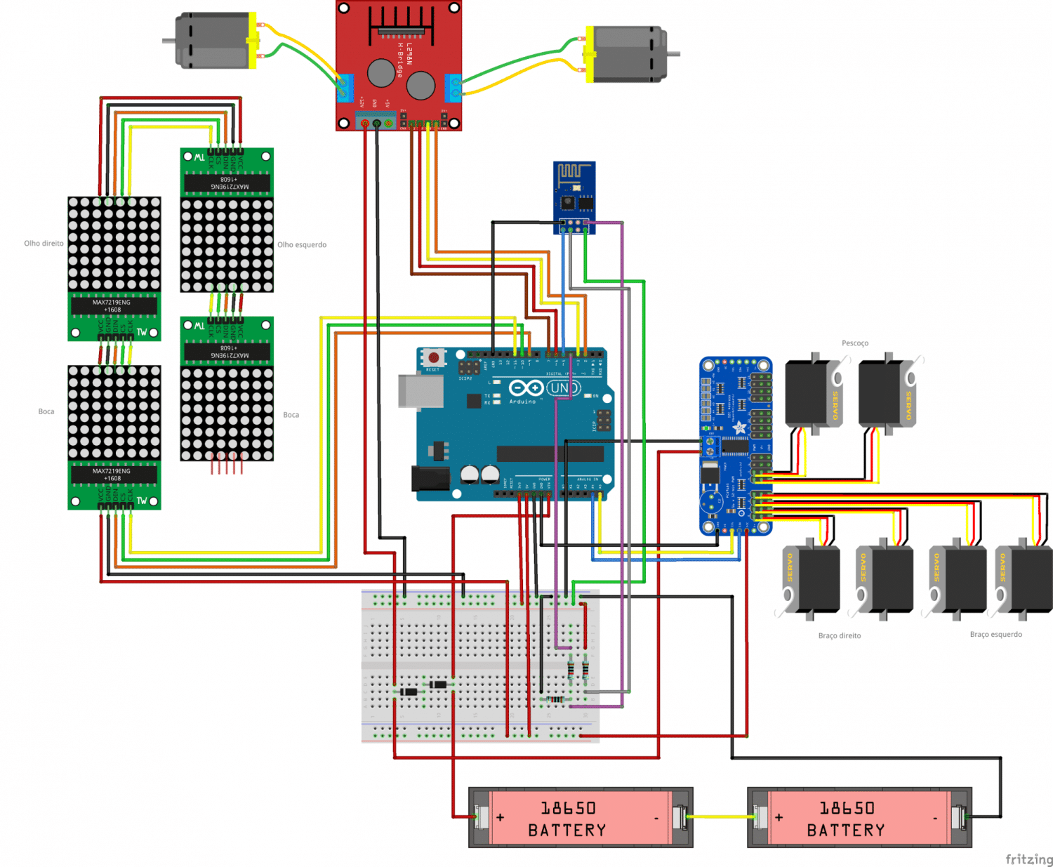 A face, composta por matrizes de LEDs, dão ao robô a capacidade de expressar emoções. Braços e pescoço acionados por servomotores dão ao pequeno autômato a mobilidade necessária para interação com os usuários. No centro de controle do robô, um Arduino Uno faz interface com todos os periféricos, incluindo a comunicação com um módulo ESP8266, que dá ao usuário a possibilidade de comandar expressões e movimentos através de qualquer dispositivo conectado a uma mesma rede Wi-Fi.