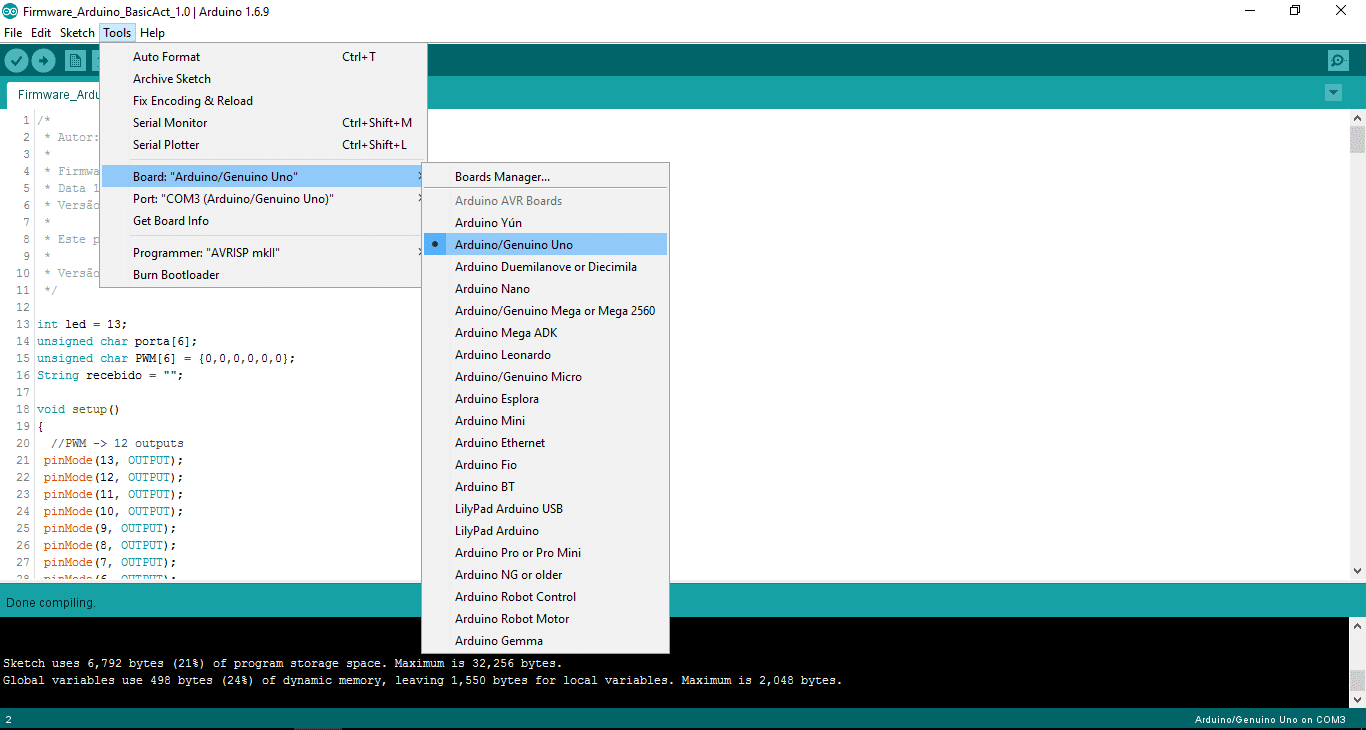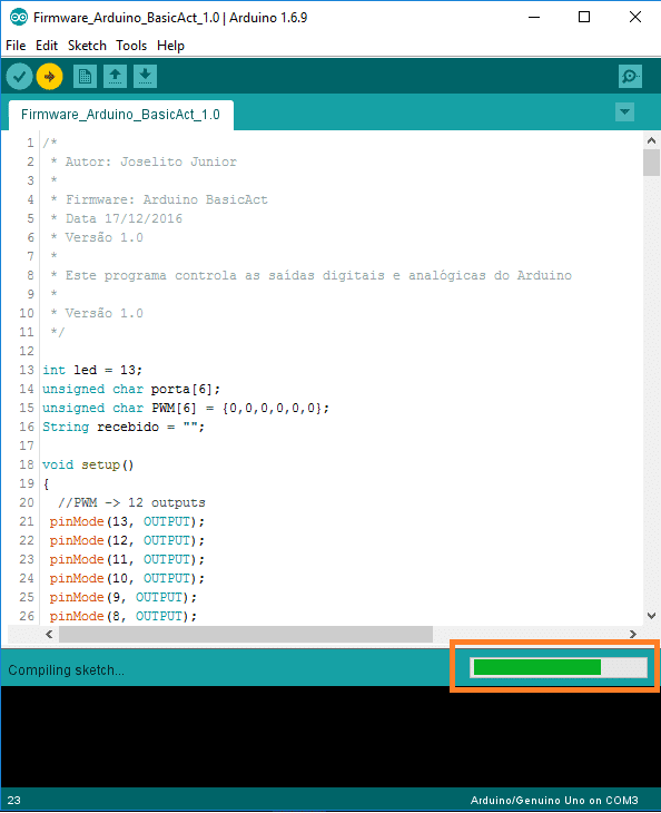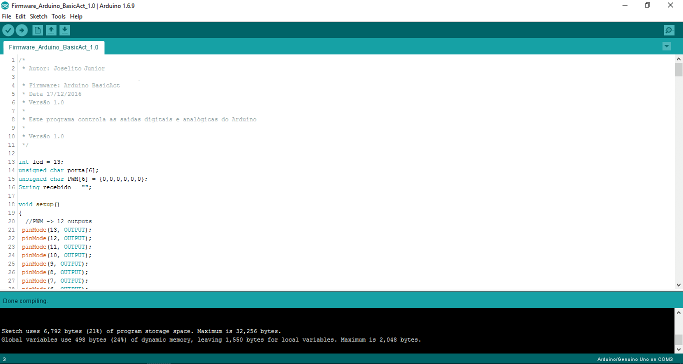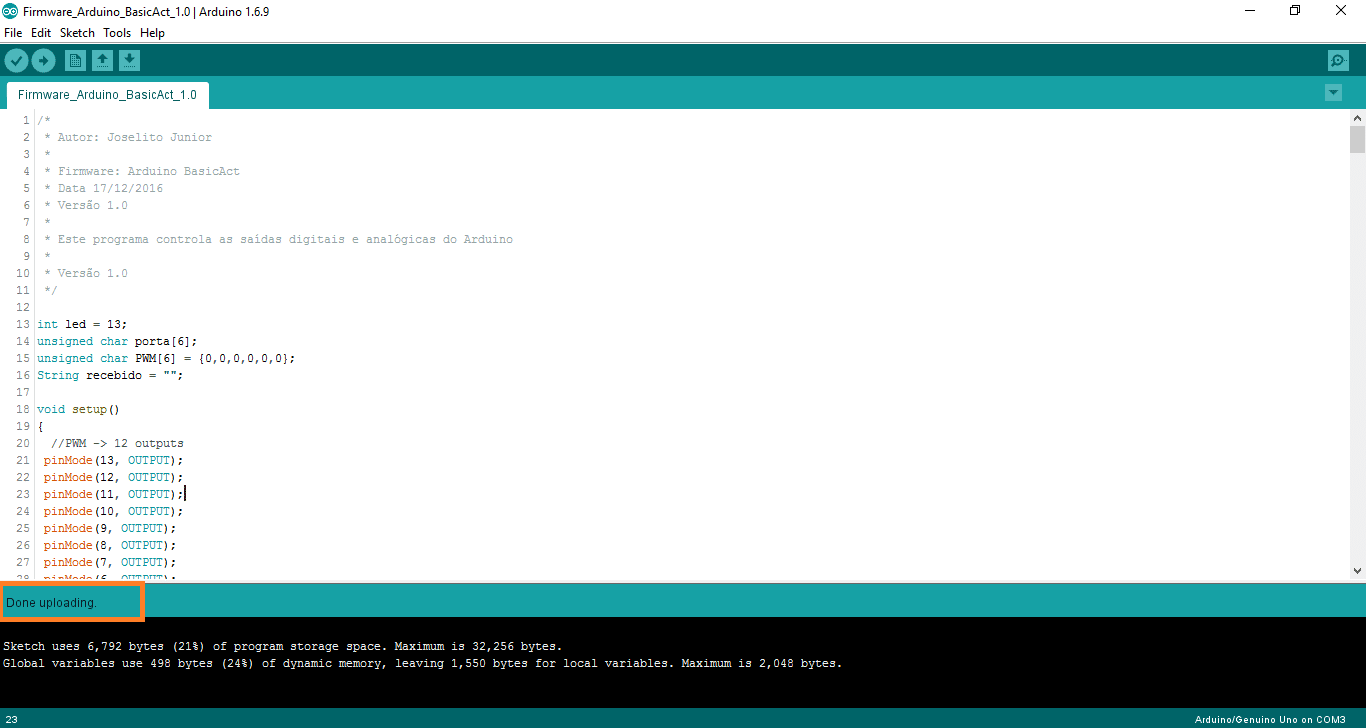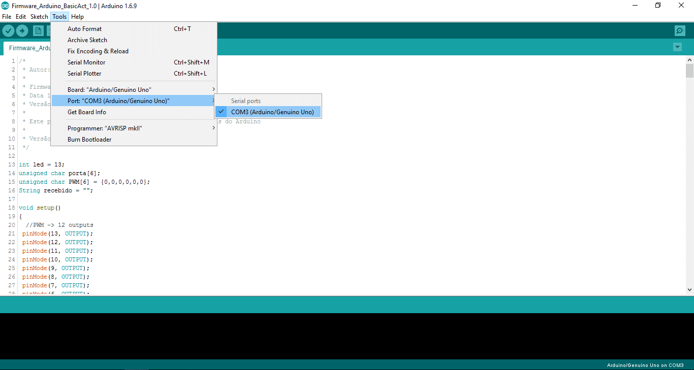 1. COMx – Recebe o número da porta de comunicação entre o BasicAct 1.0 e o Arduino, essa é a mesma porta que foi encontrada no momento da gravação do firmware.