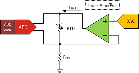 Através dessas interconexões, aplicações mais sofisticadas podem ser criadas. Por exemplo, vamos criar um monitor de temperatura hipotético com baixo consumo de energia que amostra periodicamente um Detector de Temperatura de Resistência (RTD), um resistor especial que varia (quase) linearmente a resistência com a temperatura. Um dos OPAMPs e DACs no microcontrolador é usado para criar uma fonte de polarização de corrente constante para o RTD, enquanto o ADC com Cálculos e Contexto mede a tensão diferencial através do resistor.