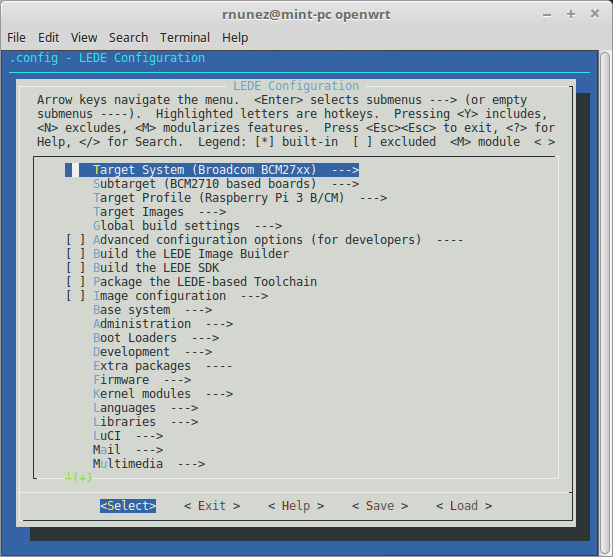 Na tela do menuconfig, deve-se escolher o sistema alvo. No caso da Raspberry Pi 3, em “Target System” selecione “Broadcom BCM27xx”. No item seguinte, “Subtarget”, selecione “BCM2710 based boards”. Por fim, em “Target Profile” selecione “Raspberry Pi 3 B/CM”. A tela do menuconfig deve ficar semelhante a esta: