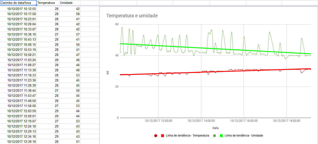 - Apesar das leituras de umidade oscilarem bastante por motivos desde protoboard até sensor ruim, com a linha de tendência linear foi possível notar a redução da umidade conforme o aumento da temperatura.