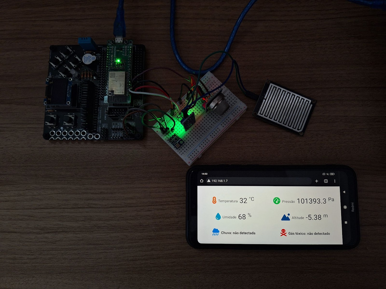 A página da web irá mostrar os dados coletados pelos sensores, indicando a temperatura, pressão, umidade, altitude e se há ou não a detecção de chuva e gases tóxicos. Então, antes de gerar o texto HTML, precisamos coletar os dados dos sensores.