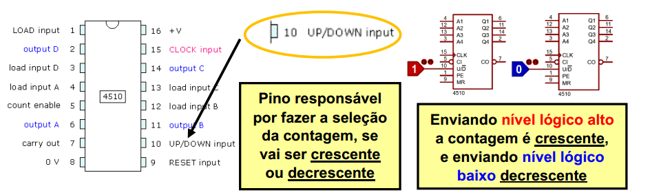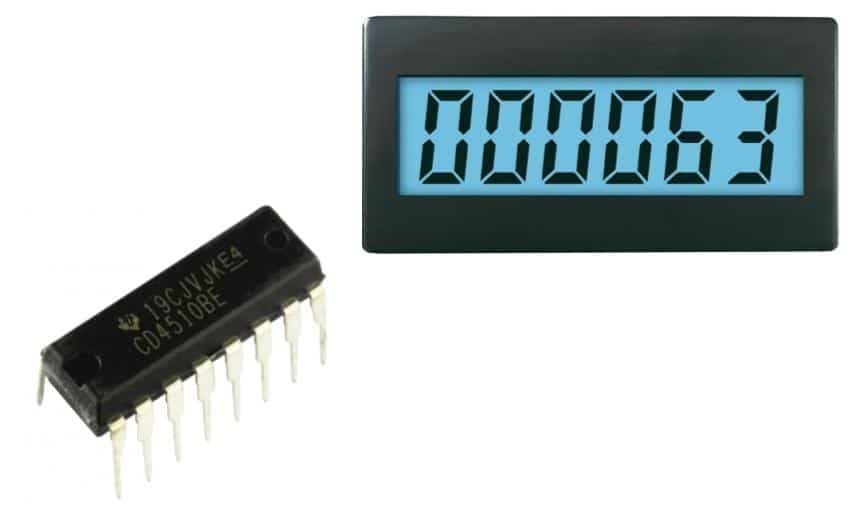 Um dos componentes mais empregados para esta finalidade é o Circuito Integrado CD4510. É um Contador Síncrono com tecnologia CMOS (semicondutor de metal-óxido complementar) e opera em Código BCD (código binário decimal 0-9) 8421 (4 bits).