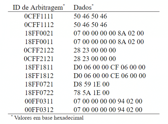 O primeiro teste realizado, denominado Computador / Apalis, simulou várias ECUs transmitindo uma grande quantidade de mensagens quase simultaneamente. A quantidade de mensagens por segundo (mps) transmitidas ao módulo Apalis iMX6 pelo computador hospedeiro variou entre 2.000 e 8.000, dependendo da taxa de transmissão da rede CAN. Três taxas de transmissão foram utilizadas nos testes: 250Kbps, 500Kbps e 1Mbps (adotada apenas para testar o desempenho do módulo na maior taxa de transmissão permitida no padrão ISO 11898). A fila de entrada da porta CAN0 do módulo Apalis iMX6 foi configurada para armazenar até 1.000 mensagens. O programa CANSender foi utilizado para enviar as doze mensagens CAN mostradas na tabela 1 repetidamente por 10 minutos ao módulo Apalis iMX6. O programa candump foi utilizado para ler as mensagens CAN recebidas na porta CAN0 e armazená-las em um arquivo texto posteriormente analisado pelo programa canmsgcount.sh.