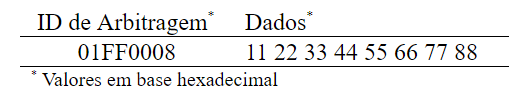 O segundo teste realizado, denominado Apalis / Computador, avaliou a velocidade com que o módulo Apalis iMX6 é capaz de transmitir mensagens CAN a outras ECUs. Novamente, três taxas de transmissão foram utilizadas nos testes: 250Kbps, 500Kbps e 1Mbps. O programa cansend foi utilizado para enviar a mensagem mostrada na tabela 2, um milhão de vezes seguidas ao computador hospedeiro. O programa Measurement & Automation Explorer foi utilizado para ler as mensagens CAN da rede.