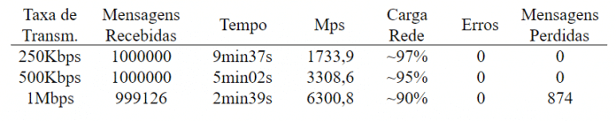 O teste Computador / Apalis foi executado três vezes para cada uma das taxas de transmissão por aproximadamente 10 minutos cada. Os resultados obtidos são mostrados na tabela 3.