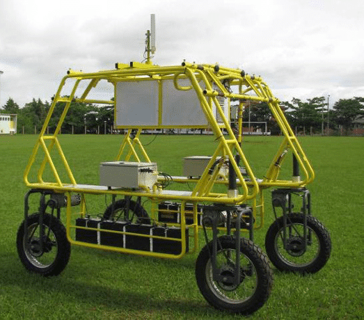 Na Escola de Engenharia de São Carlos (EESC), Universidade de São Paulo (USP), existem dois robôs móveis autônomos em desenvolvimento para coleta de dados e suporte à Agricultura de Precisão (figura 1), ambos com quatro rodas com tração independente. A velocidade e o esterçamento das rodas são controlados individualmente por controladores independentes interligados a uma rede CAN baseada nos padrões SAE J1939 e ISOBUS. Já a coordenação de movimentos das rodas para locomover o veículo, denominado no contexto desse projeto como controle de condução, é feito por um computador embarcado em cada robô. Esse computador embarcado se conecta à rede CAN para se comunicar com os controladores individuais das rodas e assim locomover o robô e esterçar suas rodas sem problemas de arrasto, utilizando os princípios da direção de Ackerman.