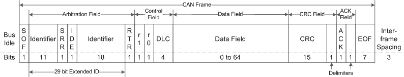 O frame das mensagens CAN no padrão 2.0B é composto por cinco campos de bits organizados entre os bits de marcação de início (SOF) e fim (EOF) do frame, como mostrado na figura 2. Basicamente, são enviados em um frame CAN o identificador de arbitragem (Arbitration ID) de 29 bits, alguns bits de controle, o tamanho do campo de dados (DLC) e de 0 a 8 bytes de dados. A verificação é feita pelos bits no campo CRC e a confirmação é feita pelo bit no campo ACK, enviado por pelo menos um controlador CAN que recebeu a mensagem com sucesso. Além disso, bits de preenchimento (stuffing bits) são inseridos a cada cinco bits iguais para evitar falhas de comunicação, exceto nos campos CRC, ACK e EOF. O valor desses bits é o inverso dos valores repetidos. Quando um controlador recebe uma sequência de seis bits iguais, ele interpreta como uma falha de comunicação. Sendo assim, o tamanho de um frame pode variar entre 64 e 140 bits, o que permite transmitir até 3.731 mensagens por segundo (mps) à 250Kbps e 7.462 mps à 500Kbps.