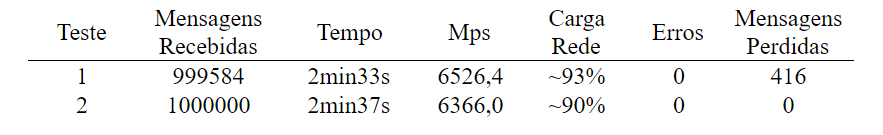 Os valores na coluna Tempo foram calculados utilizando o programa time do Linux. A carga da rede nesses testes foi superior à carga nos testes anteriores por causa das mensagens enviadas conterem o número máximo de dados permitido (oito bytes).