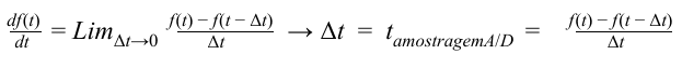Esquecendo um pouco as aulas de cálculo agora, vamos observar melhor que essa expressão diz, ou seja uma derivada nada mais é do que a subtração de um valor de uma função para um dado t e um valor prévio deste mesmo t, onde a diferença entre eles é muito próxima de zero ou mesmo zero. Matematicamente isso não é possível, porém se fizermos esse t suficientemente pequeno, podemos obter uma aproximação muito similar à derivada pela definição, então se queremos um espaçamento pequeno, por que não escolher o valor da taxa de amostragem do conversor A/D? então:
