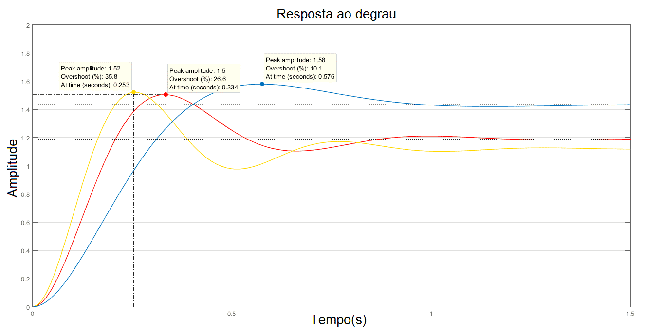 Observe que este valor calculado, é o excedente em porcentagem do valor em regime permanente. É de extrema importância para o leitor saber que também é possível obter o valor do overshoot com base nos parâmetros da equação característica do sistema: