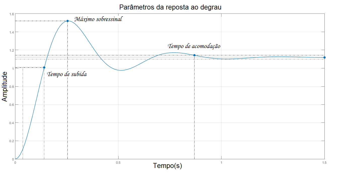Tempo de acomodação: Este parâmetro refere-se ao tempo necessário para que a resposta do sistema se estabilize dentro de um intervalo percentual do seu valor em regime permanente.