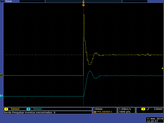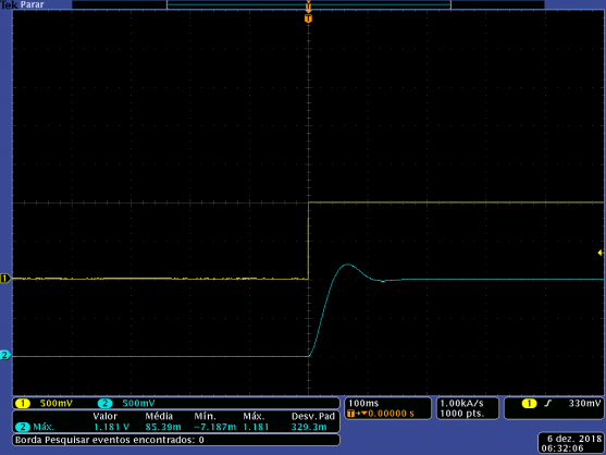 Em azul, está representado o sinal de saída, ou tensão no capacitor, de acordo com a Figura 1 e em amarelo o sinal de controle, ou sinal de entrada, tensão X, na Figura 1. A resposta real desse controlador é apresentada na Figura 7 a seguir: